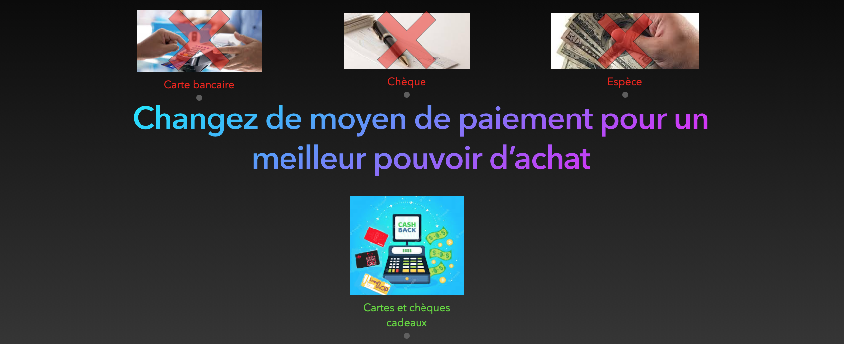 Pour cela il vous suffit de commander vos cartes cadeaux avec lesquels vous règlerez tous vos achats en caisse à la place de votre cb, chèque ou éspèce ( la transaction est gratuite pour les e-cartes, vous ne payez les frais de port que pour les cartes physiques ).