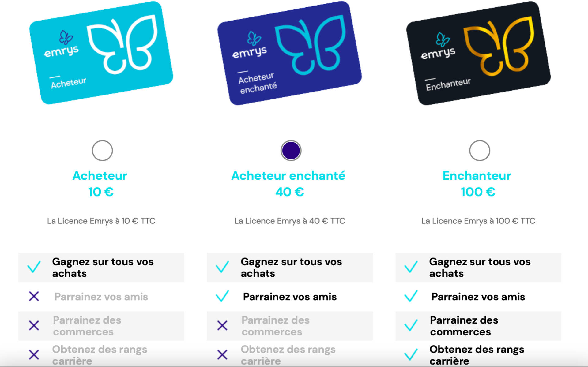 - Le statut Acheteur Enchanté (40€/an)Si tu souhaites parrainer occasionnellement. Et grâce aux bonus de parrainage obtenir plus de crédit d'achat pour auto financer une partie de tes achats voir obtenir tous tes achats gratuits, grâce aux bonus parrainage sur 4 générations.